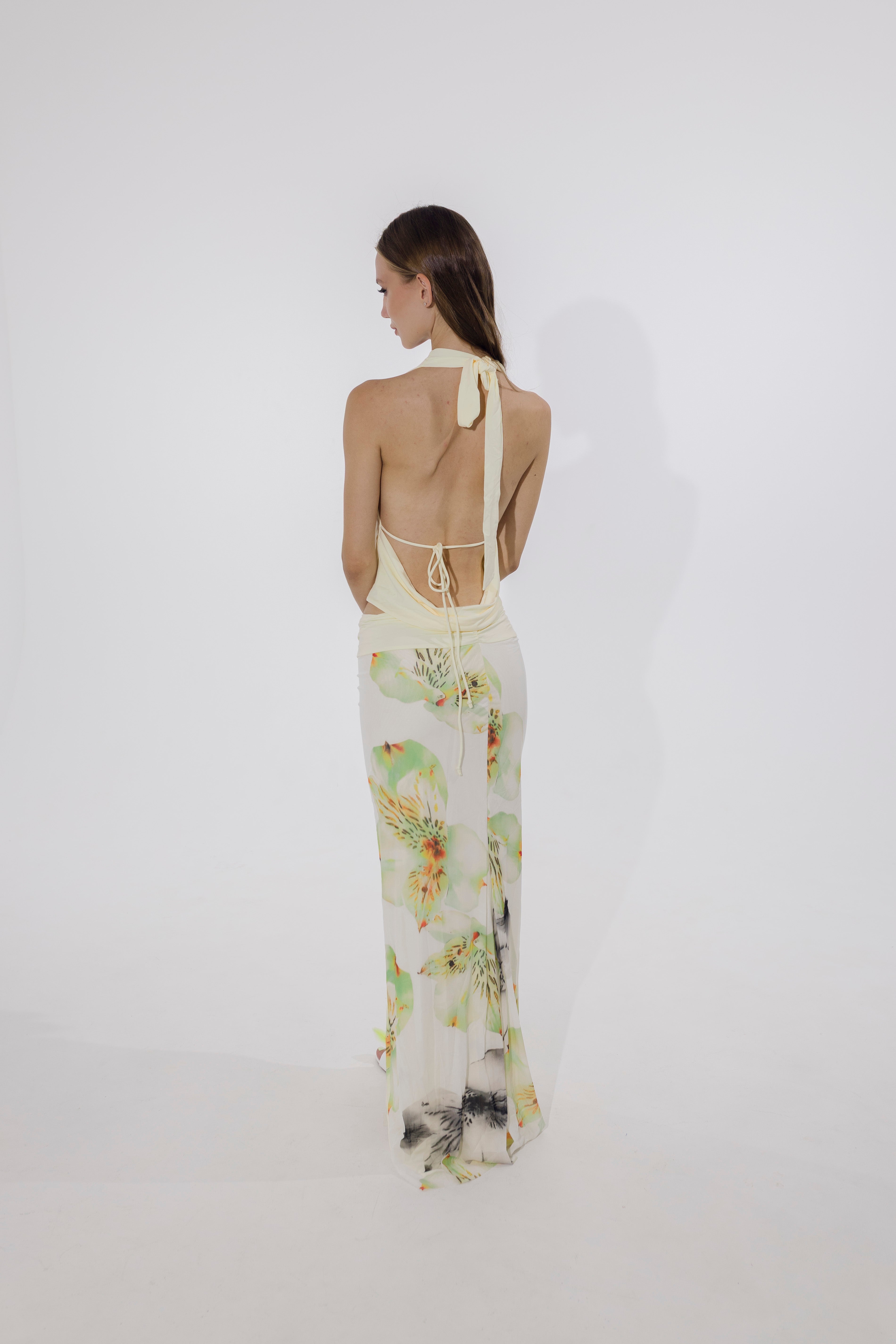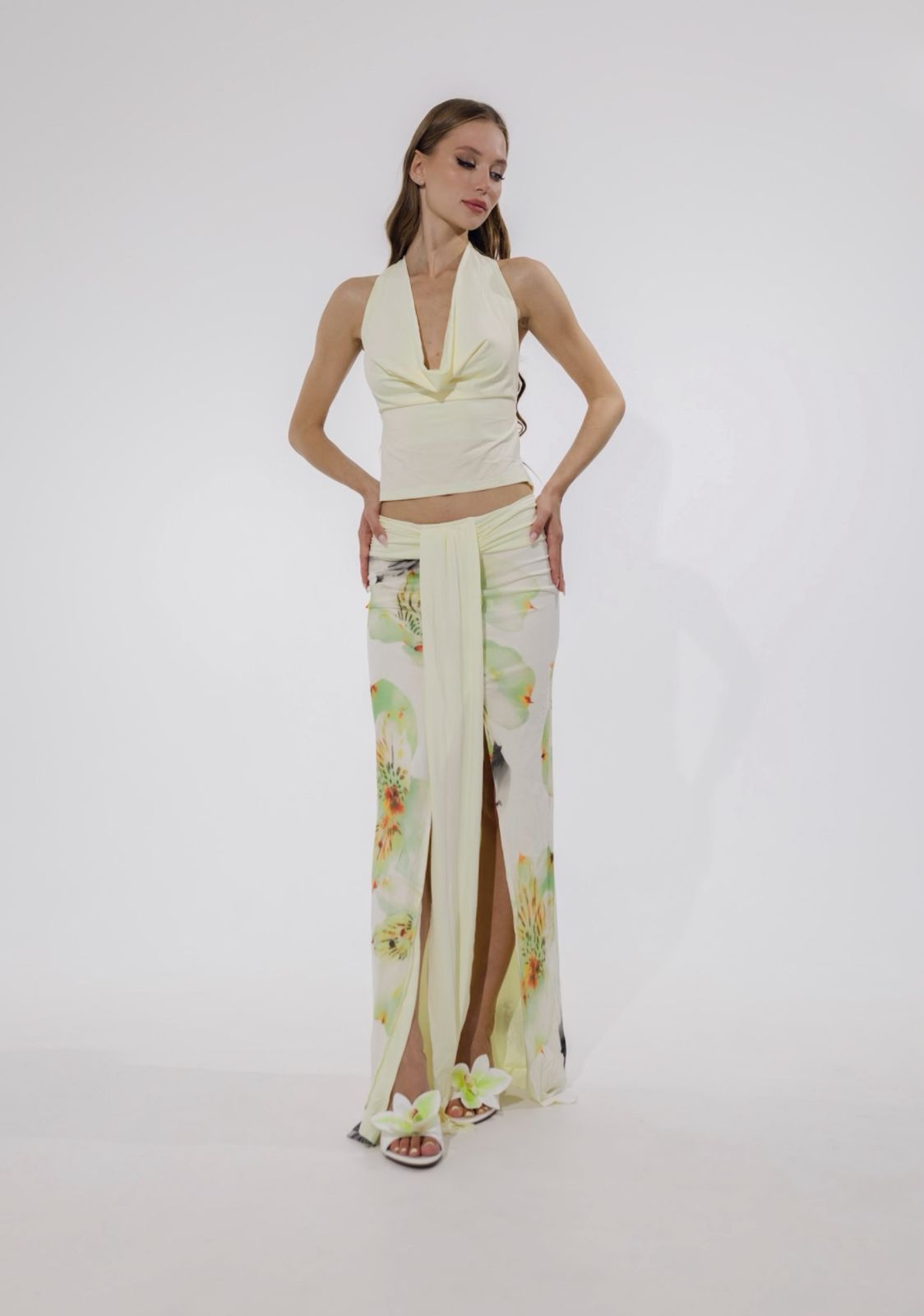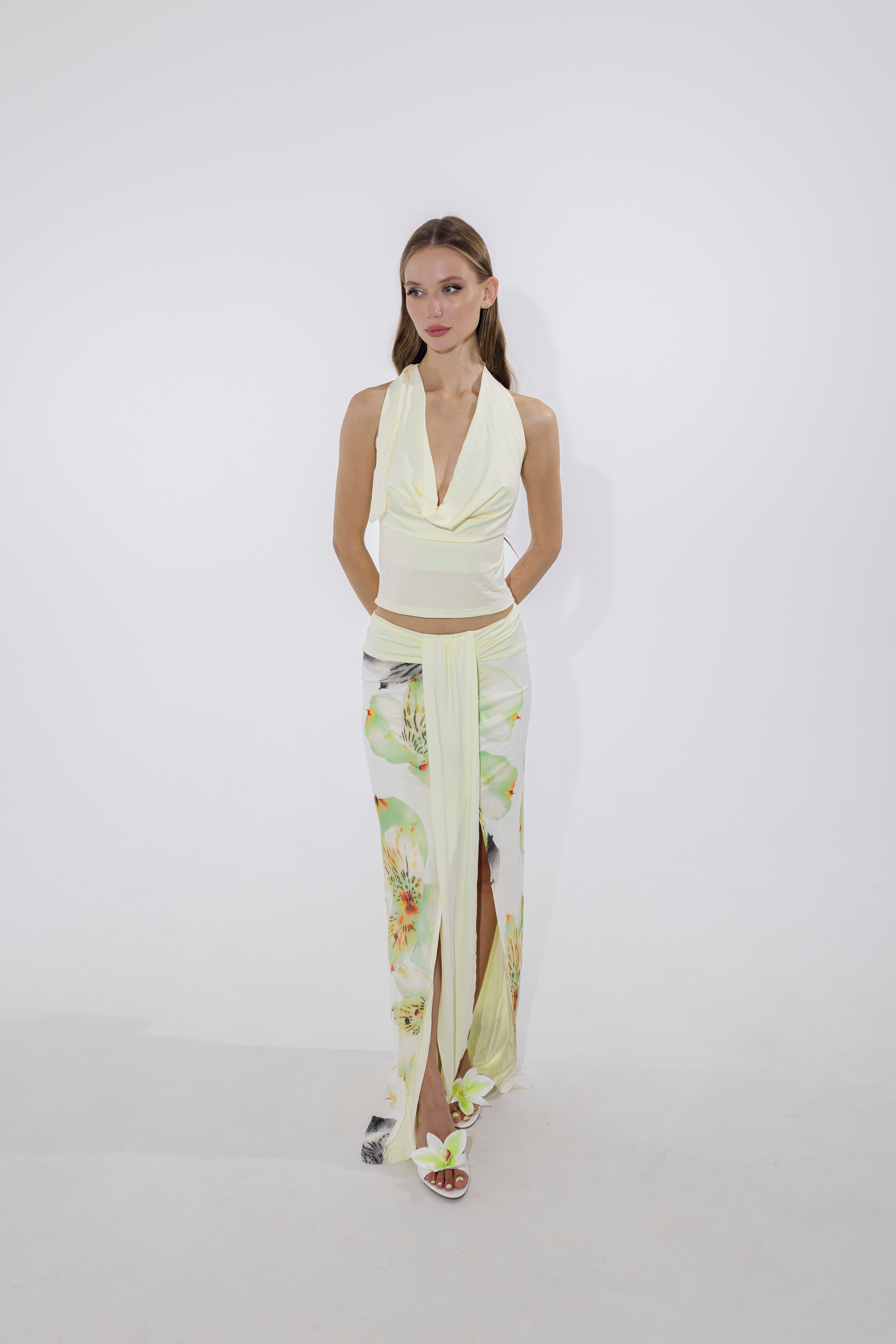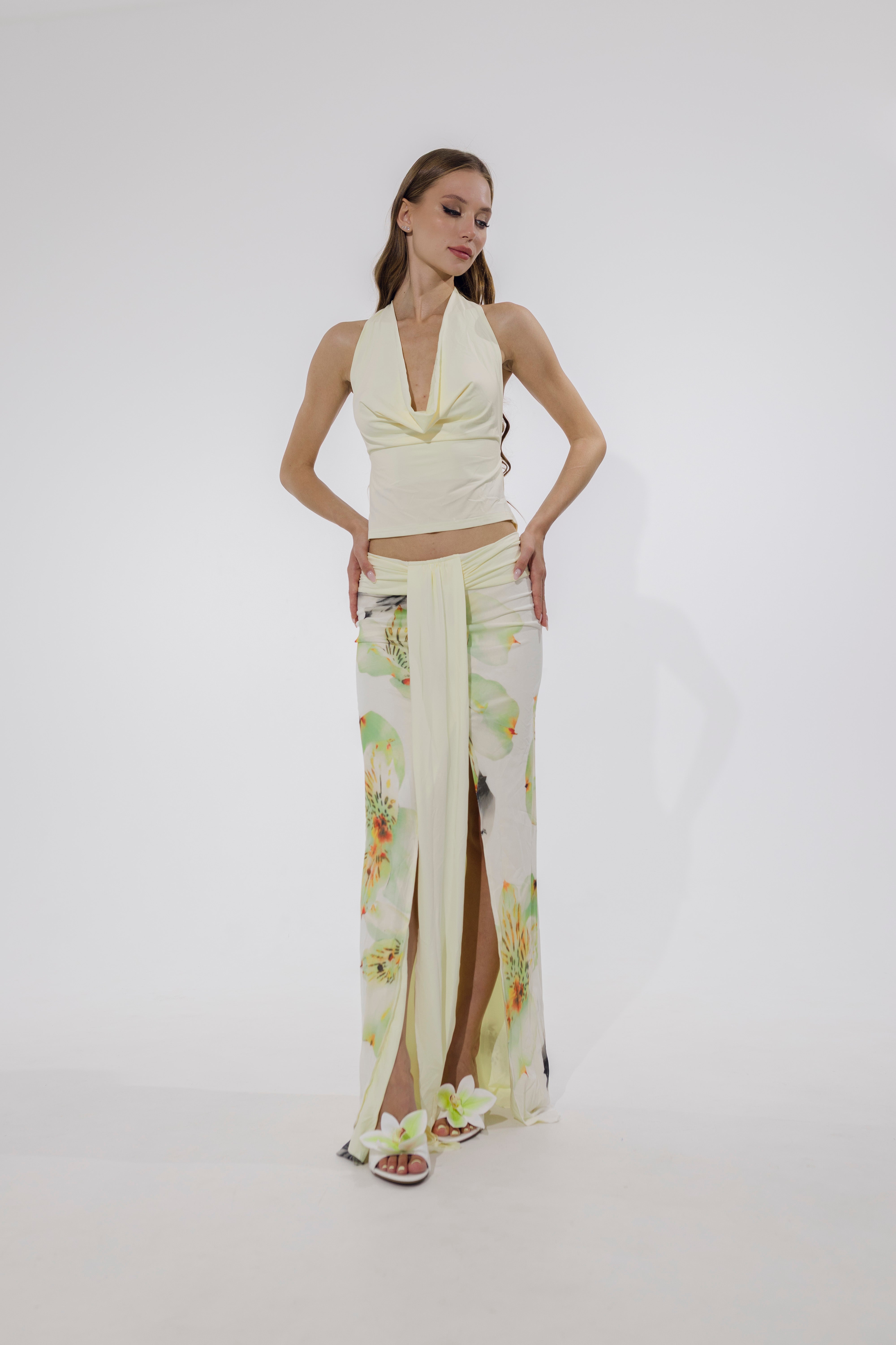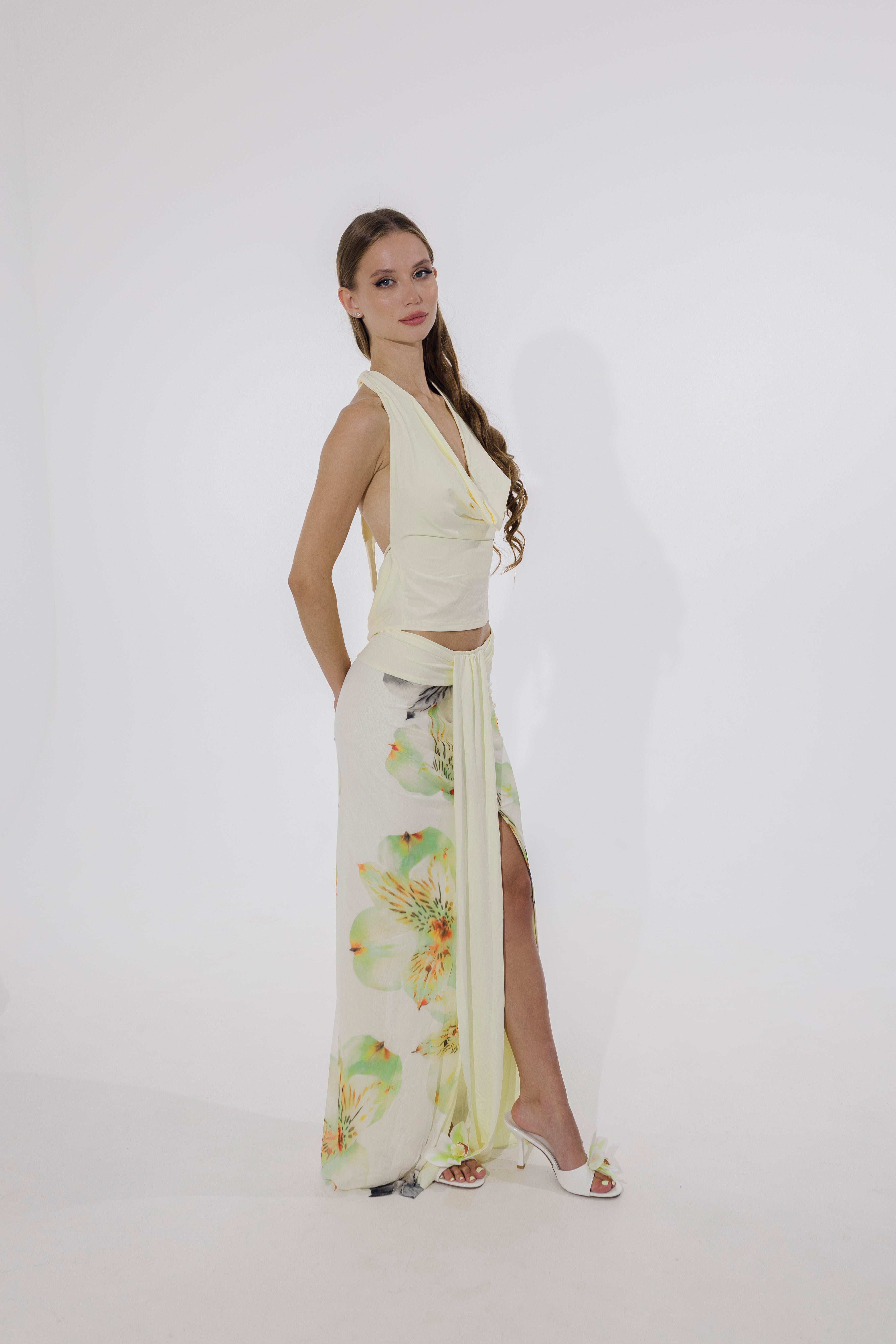 Soft, romantic, and a little rebellious — the Petal Dusk Set is your canvas for slow sunsets and spontaneous nights out. This two-piece halter-style ensemble in floral beige features an open-back top and flared skirt, made from light polyester that skims the body with a breeze-like feel. Dress it up with strappy heels or wear it barefoot on the beach. Either way, you’re unforgettable.