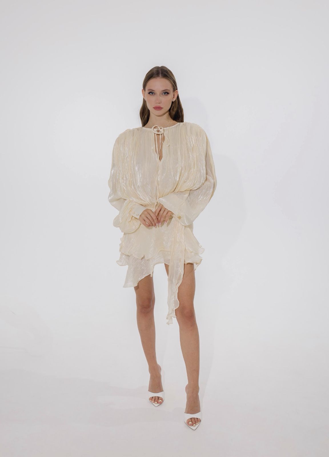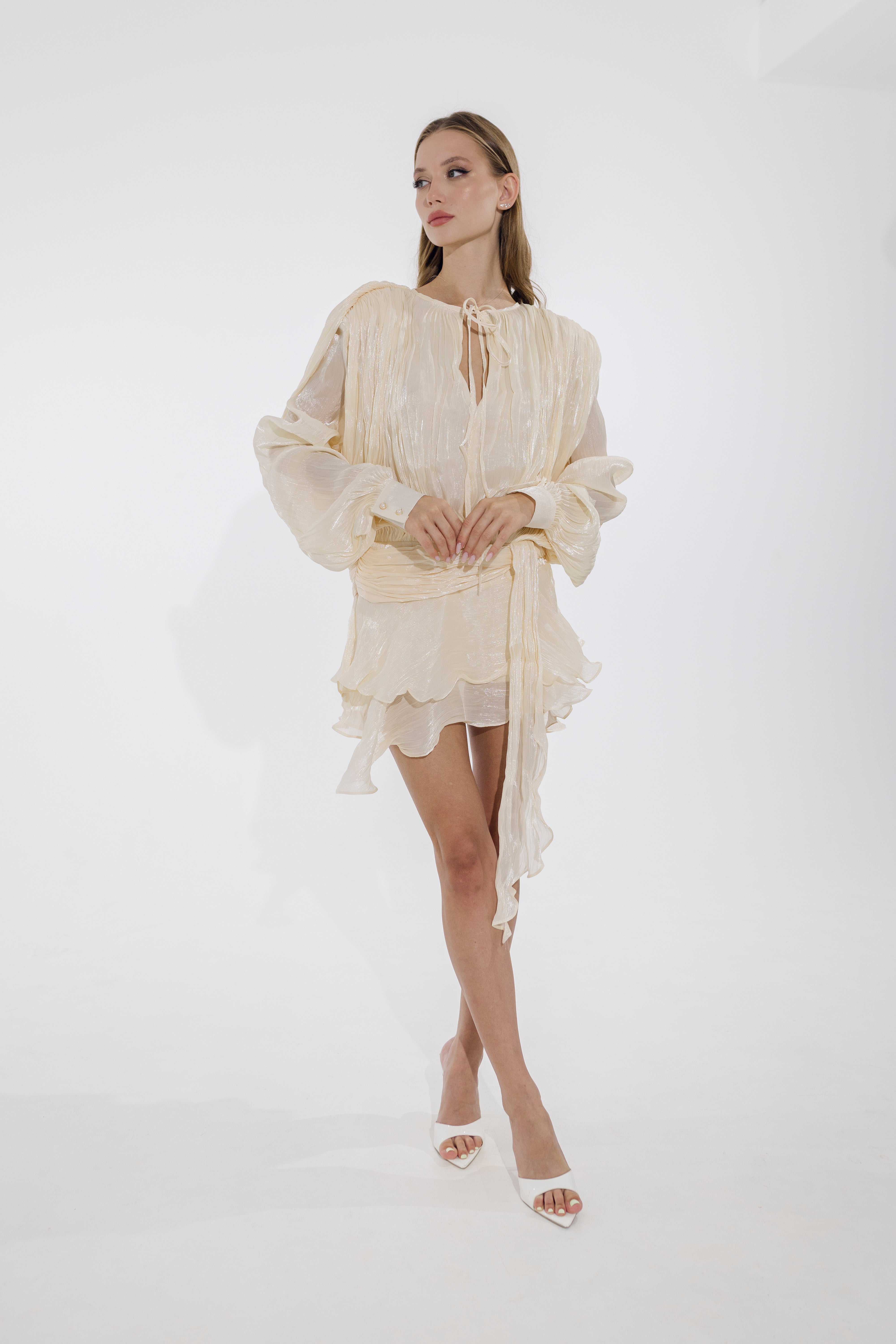 A flirtation with elegance. The Whipped Silk Mini is a ruffle-waist mini dress designed to float as you move — light, airy, and just bold enough. In a creamy beige shade and soft polyester fabric, this piece blends feminine charm with contemporary cool. It’s the go-to for rooftop drinks, garden weddings, or date nights that end in stargazing.